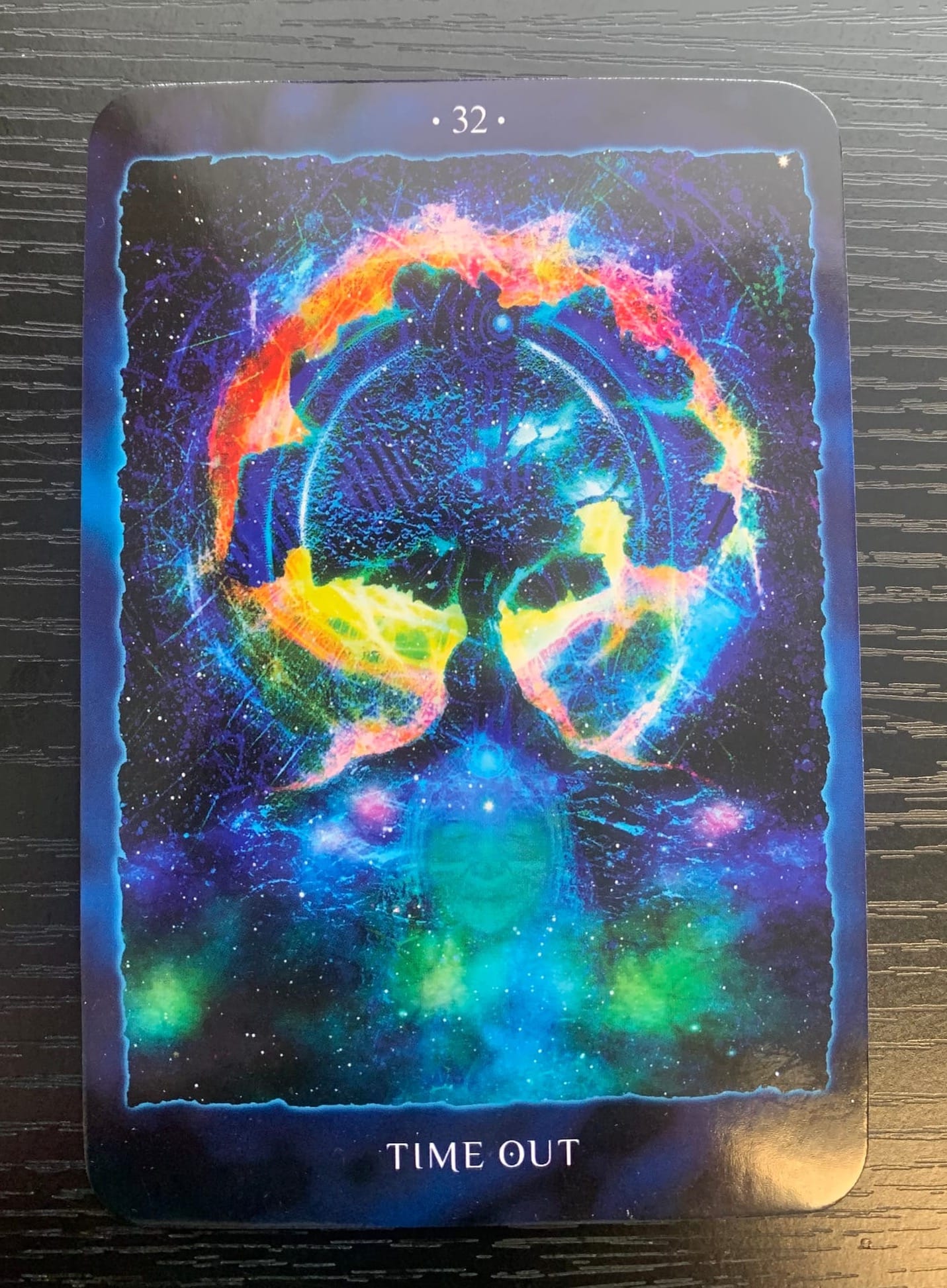 The first card for the collective reading this week is 32-Time out. When looking at this card, I am drawn to the imagery of the tree surrounded by this colorful energy. This imagery could be seen in one respect as you sitting within the power, within spirit, and letting that serene energy nurture your growth. It could also be seen as you staying calm and unmoved by the chaos of the energy around you.