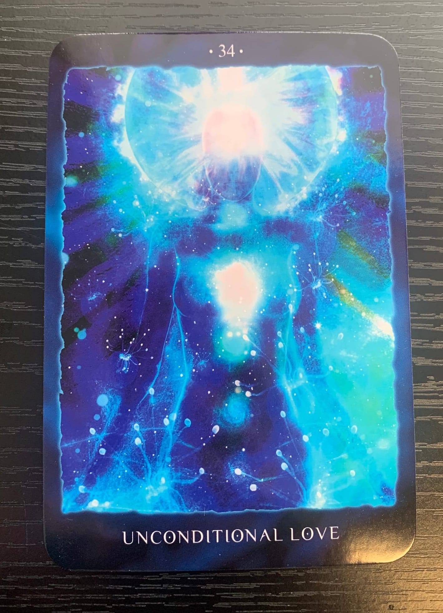 The second card for our reading today is 34-Unconditional Love. This card shows an ethereal, celestial body, floating in a sea of stars, with a crown of light. We can also see that their crown, third eye, and heart chakras are the most lit up.