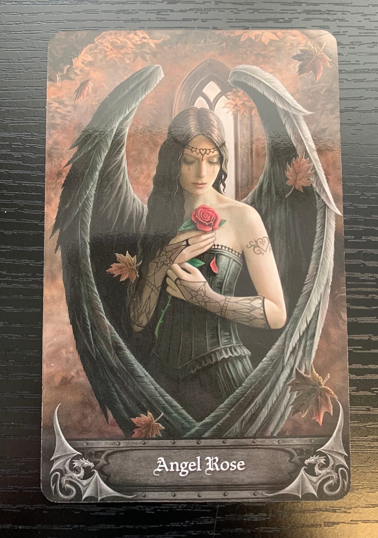 The first card in our reading today is Angel Rose-Perspective. The figure is pictured in a very muted outfit matching her wings that are spread protectively around her. You can see that she has tears streaming down her cheeks, is surrounded by falling leaves, and even her rose seems to be decaying, with one of its petals starting to fall.
