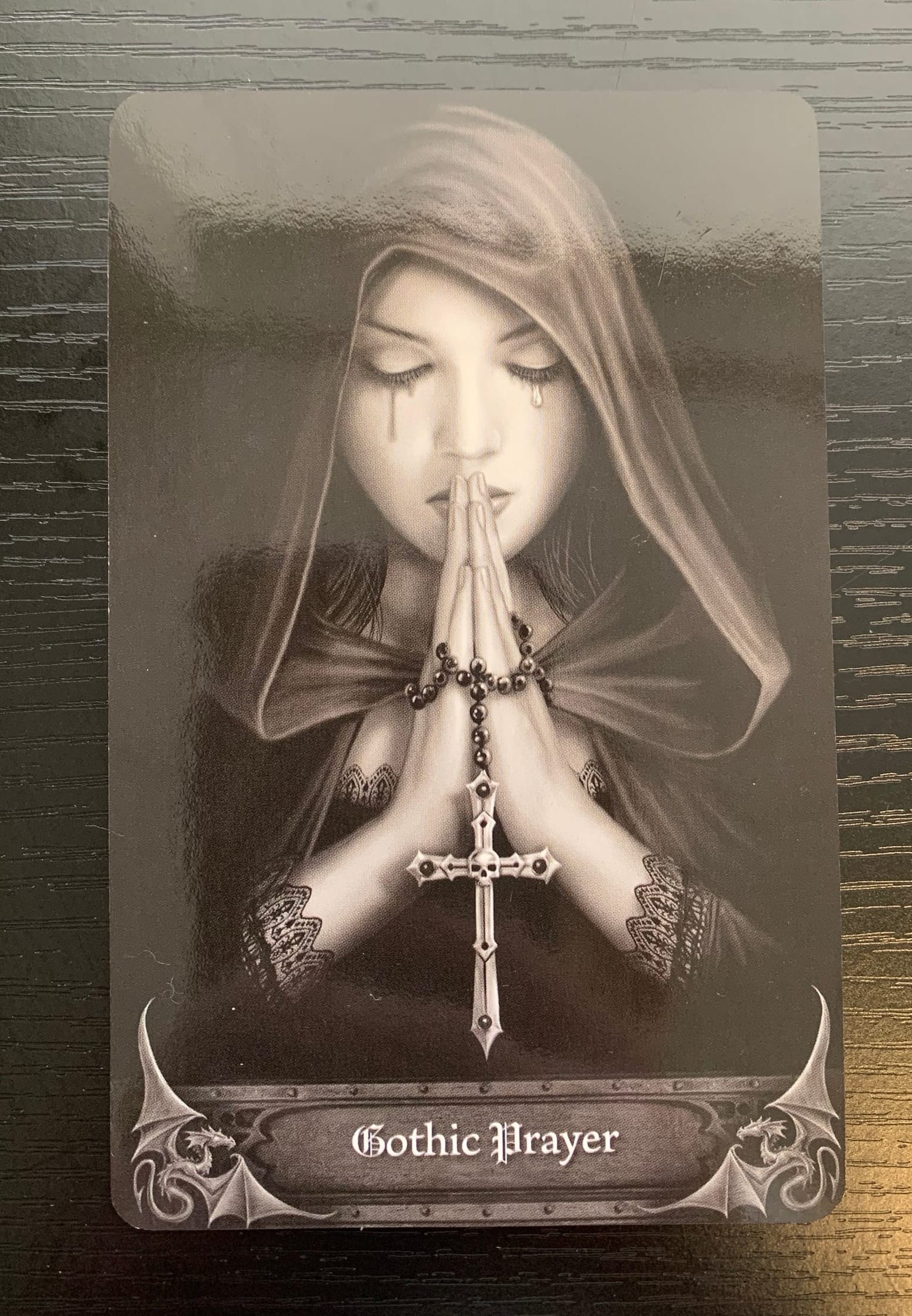The second card of our reading is Gothic Prayer-Hope. We see a woman with her eyes closed, tears (also) streaming down her face, as she seems to whisper her prayers. You may also notice that while one side of the tears on her face is matte, and dark, lends to the feeling of sadness or despair, the other side is bright and impassioned, as if even her tears are hopeful.
