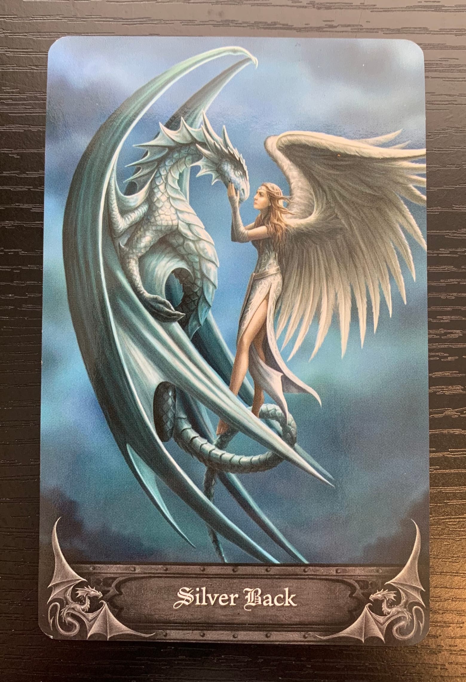The rune that popped out for our reading today was Ehwaz (pronounced “A-was”). This rune was thought to depict two horses touching snouts. This rune can symbolize relationships, progression, and trust. The symbol mirrors the imagery of the Silver Back card where the dragon and the angel are leaning in close as they commune.