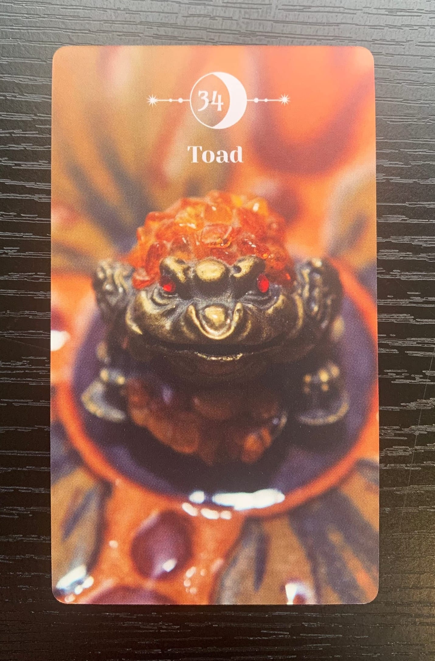 The first card of our reading this week is 34-Toad. We see an ornately gilded toad, with vibrant red eyes and an intense stare, who is carrying gemstones on their back.