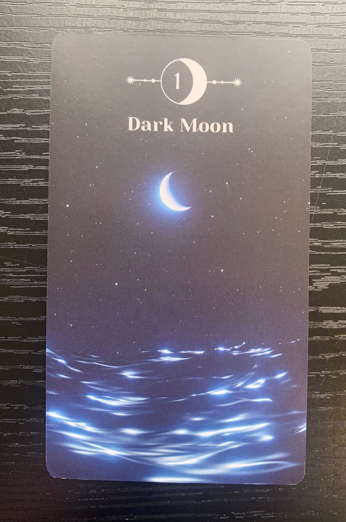 The second card of our reading today is 1-Dark Moon. We see a waning crescent moon surrounded by a sea of stars. She is sitting serenely over a dark body of water.