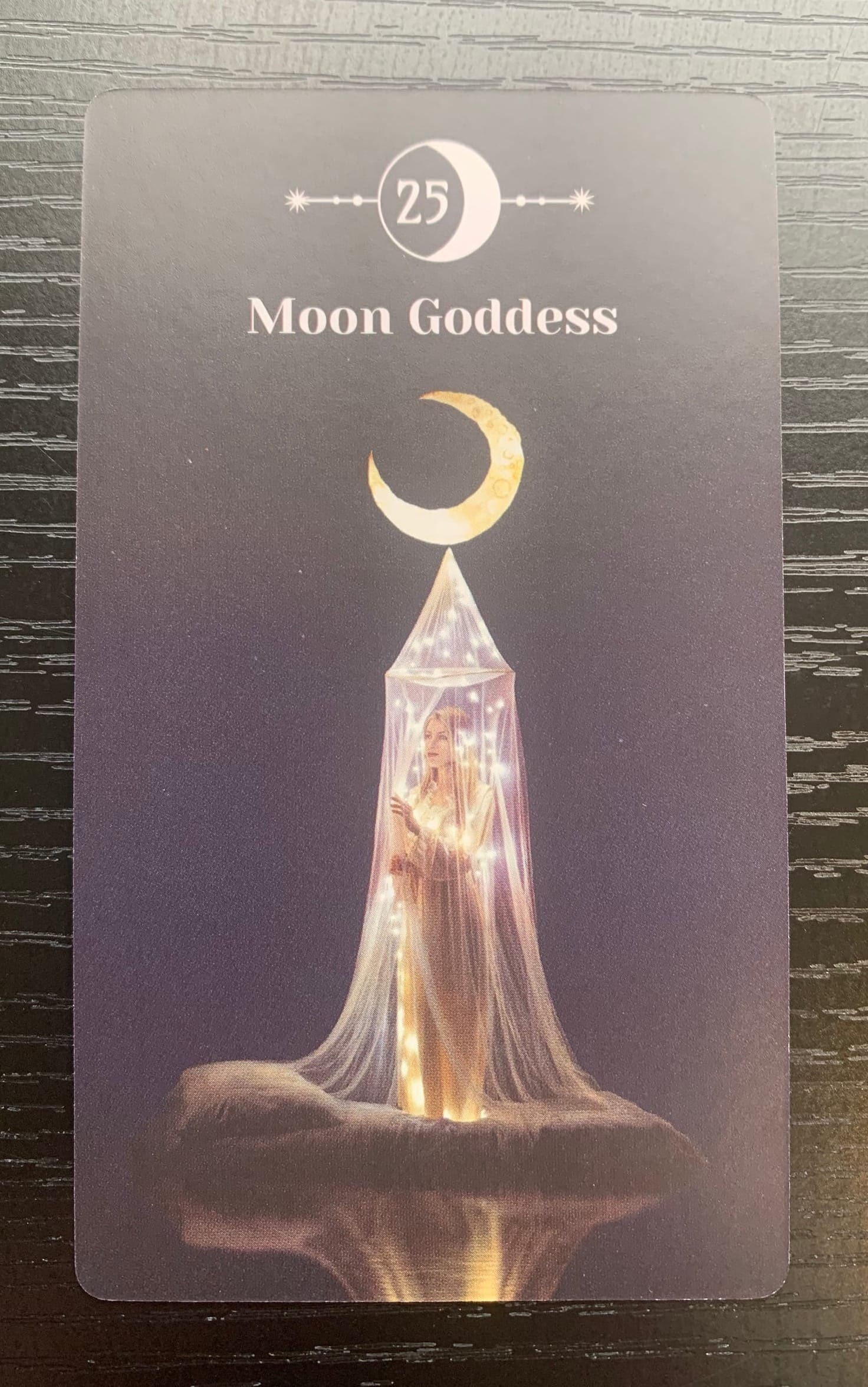 The last card of our reading was 25-Moon Goddess. On this card you see a woman, draped in stars as she stands on a comfortable bed that is seemingly floating on water. The stars are raining down on her and seem to be coming down from the moon herself.