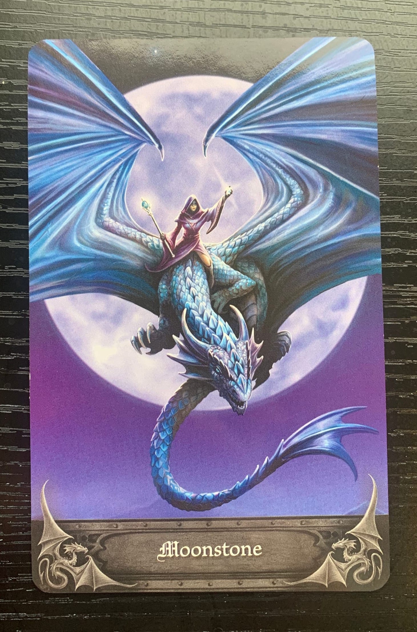 The first card of our reading this week is Moonstone-Healing. We see a fierce dragon, wings spread and claws out with a rider carrying a luminous stone and staff. This card, despite having intense imagery, feels very calm, with the moon guiding the way and the shining stones held up as an offering to those in need.