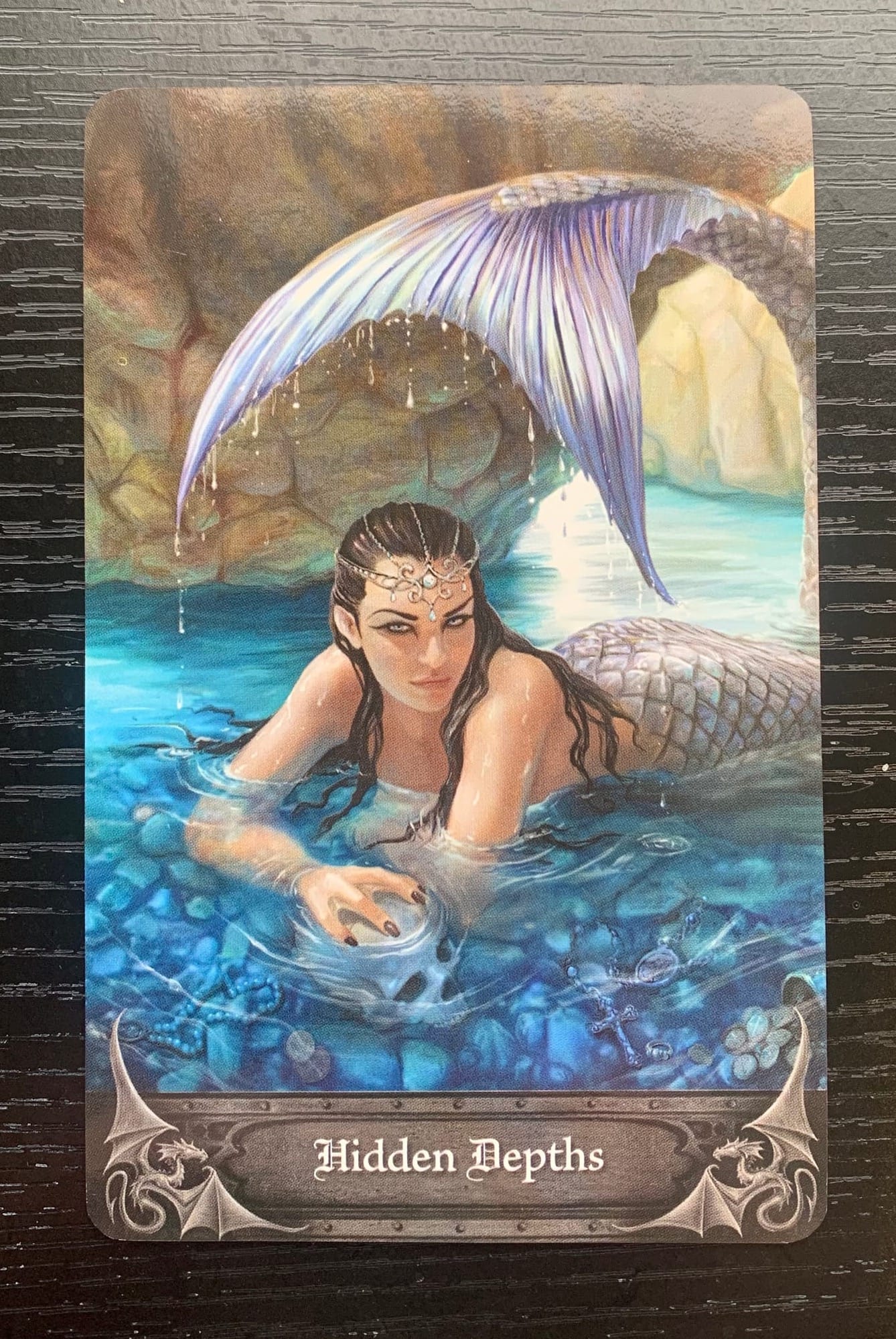 The second card for our reading is Hidden Depths-Secrets. We lock eyes with a seductive mermaid, whose glorious tail, headpiece, and makeup draw you in and make you want to step closer. However, upon further inspection you can see many things hidden beneath the surface of the water that she is inhabiting, including a skull, jewelry, a cross, and coins.