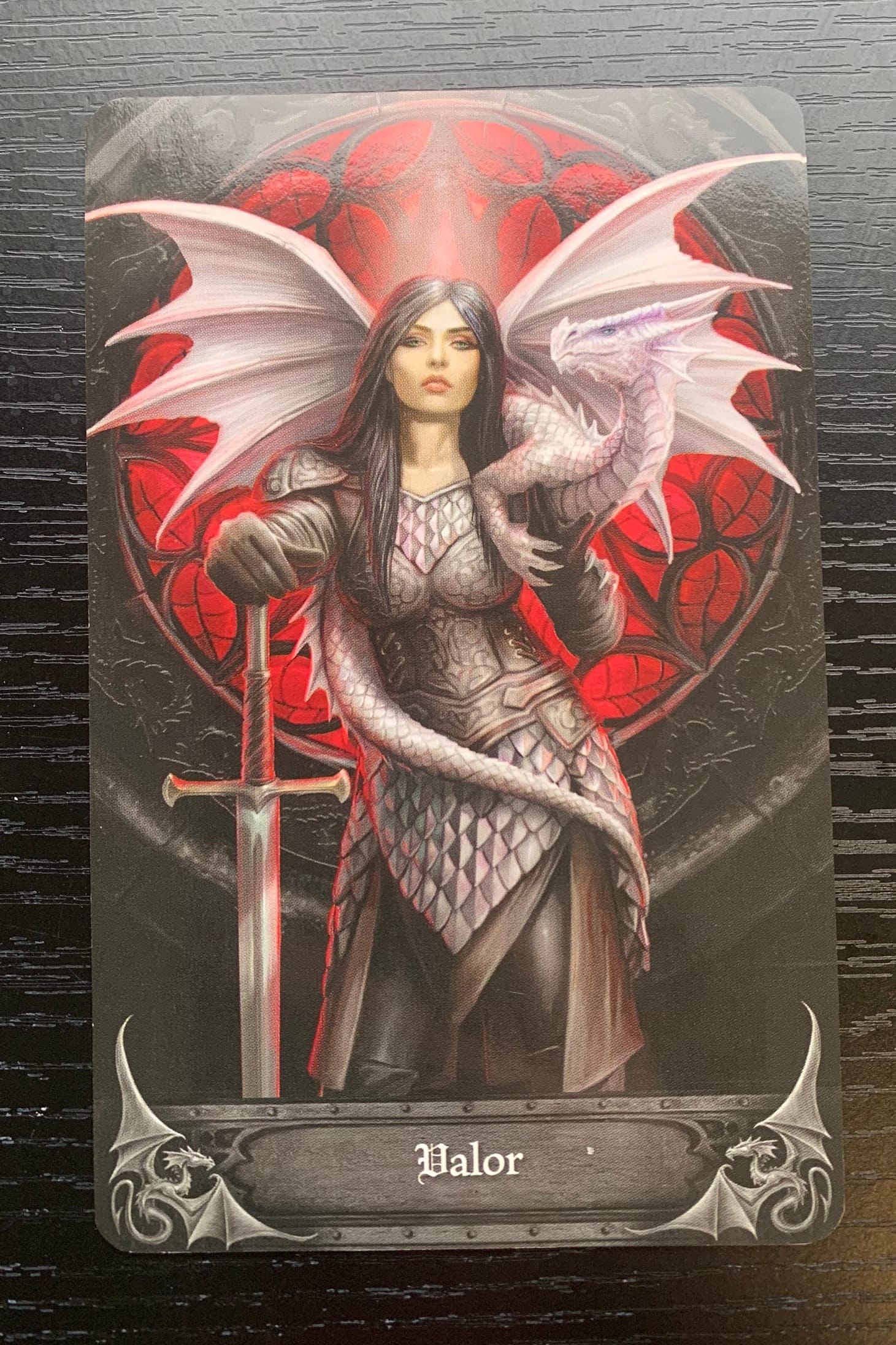 The last card of our reading this week is Valor-Battle. We see an armor-clad woman, confidently holding her sword, with a dragon perched on her shoulder, its tail wrapped protectively around her waist. You can also see the eerie red glow coming in from the window.