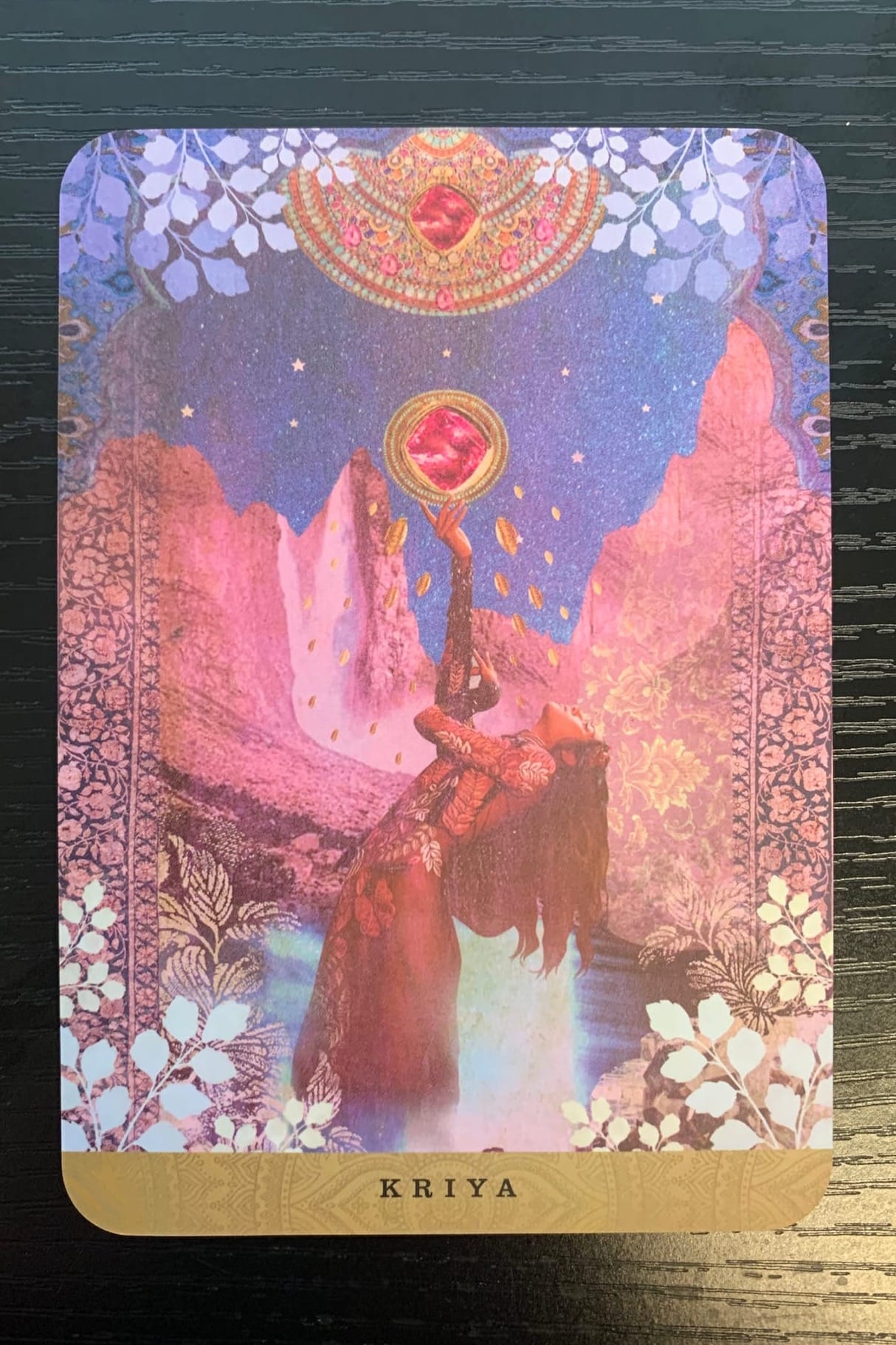 We learn from the guidebook that Chinnamasta is a “goddess of radical self-transcendence,” who “has come to guide you in this massive state of transformation, as you turn passion into spiritual energy.” While slightly more unsettling than other guides that have presented themselves in our readings, her gift “is to transmute the darkest of times into the most powerful energies. Carry her fierceness as you tear off a former head you once had and experience the inner peace that comes with being divinely yourself.” This card reinforces that while part of the process of self-actualization is release and surrender (our first card), there are other aspects of transformation that require more cutting (pun intended) forms of release. Not every part of the healing journey, or life for that matter, will be easy and beautiful, but as Chinnamasta reminds us, there is power in destruction.