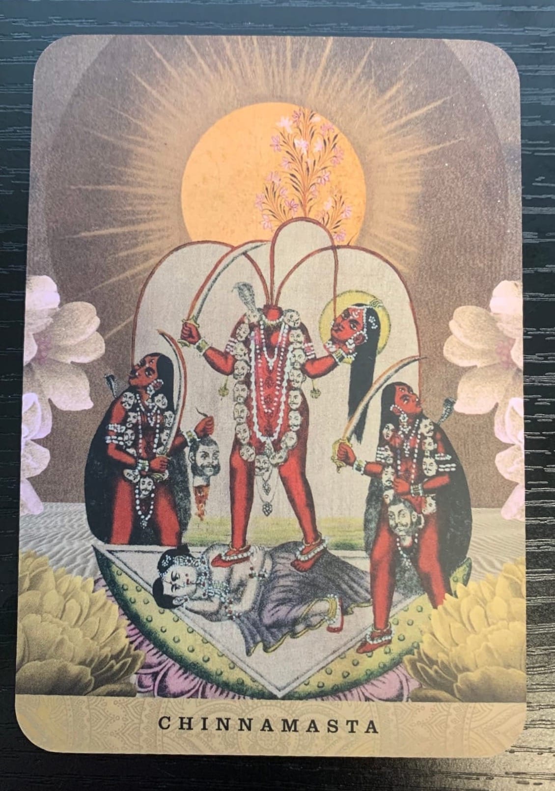 The second card of this week’s reading is Chinnamasta. This card has a lot of chaotic energy. We see the person in the center holding their own severed head in one hand with their sword in the other. Their blood is flowing up and out, both into their own mouth and into the mouths of the two others that are dressed similarly. The main figure is also standing upon two people who seem to be locked in a lover’s embrace. Contrasting all of this (quite graphic) imagery is the bright sunny background and the flowers blooming all around.