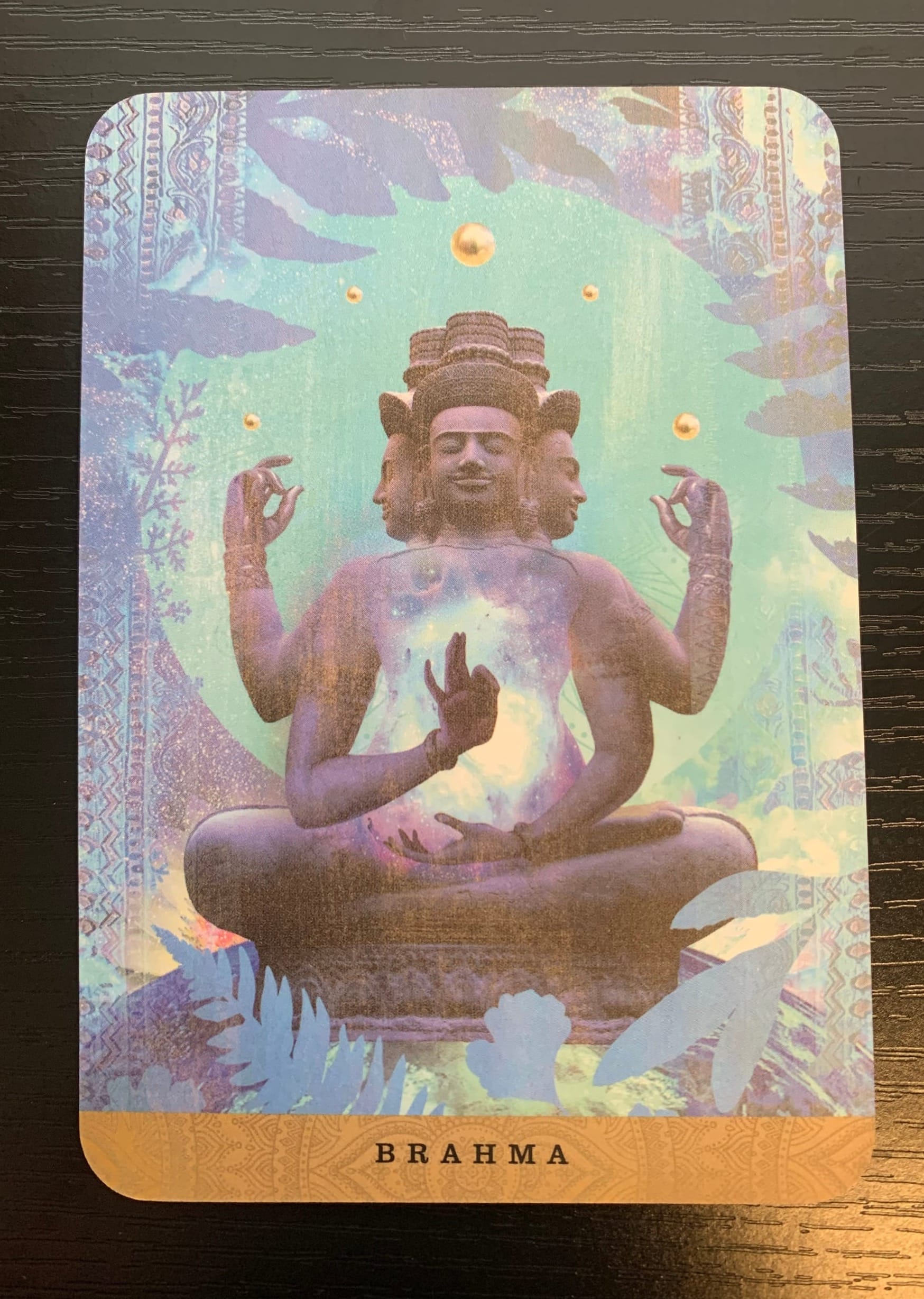 We learn that Brahma is another deity, the “god of creation.” We read that Brahma brings the message that “now is the time to plant [your creative] seed into the Earth and water it with your intention so it sprouts to life, benefitting all those around you,” and also that he calls into focus “the time cycle through which the world moves from creation to sustenance, from sustenance to dissolution, and from dissolution to new creation.” This card feels reassuring and calming, as if Brahma is reminding us that the end is never the end. We can use the shedding of our old layers as fertilizer for our new growth.